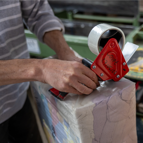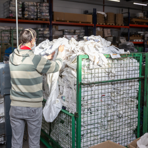Parmi ses activités, le Relais Est produit également des chiffons industriels. Fabriqués à partir de textiles en coton ne pouvant plus être portés, ces chiffons sont découpés dans notre centre de tri situé à Wittenheim. Cette filière permet de recycler près de 200 tonnes de textiles par an, contribuant ainsi à une économie circulaire efficace et engagée.